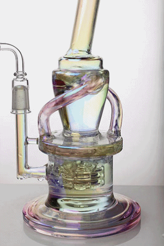 A curvy silhouette and color glass accents make this percolator ice bong from Genie Glass a beautiful piece of glass art. It features a clear glas...