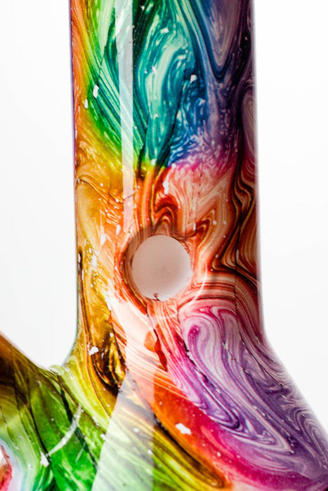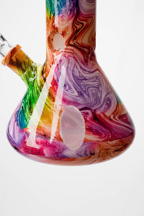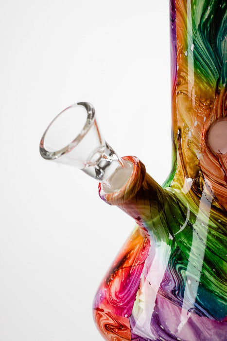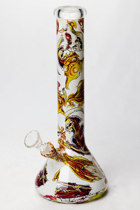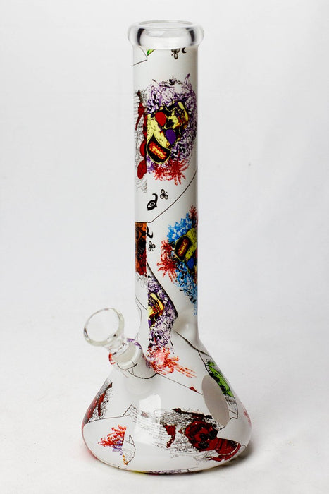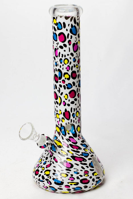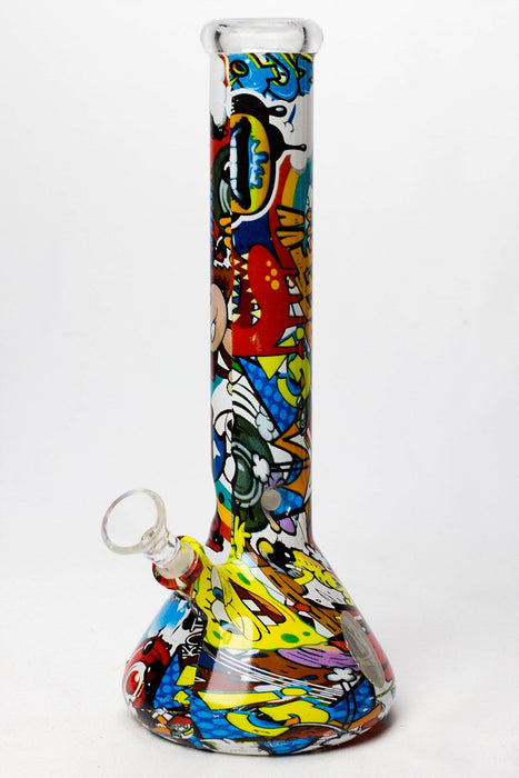 Only 10 inches high, this Graphic wrap glass bong hits hard. Don't let the size fool you. It smokes as nicely as it fits in the hand. Comes with nice huge glass bowl stem and 3 pinched ice catcher. The Bowl stem is removable. Base holds a nice amount of water. Nice portable bong.