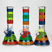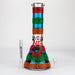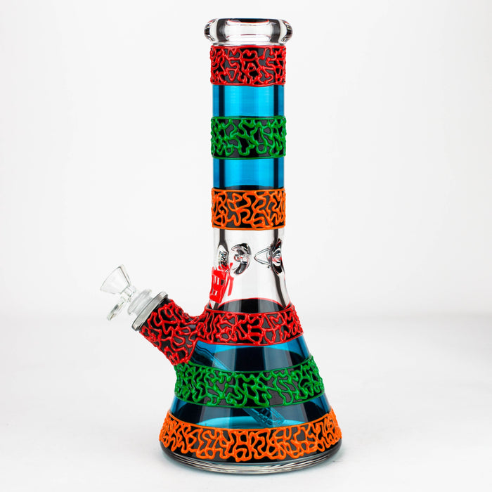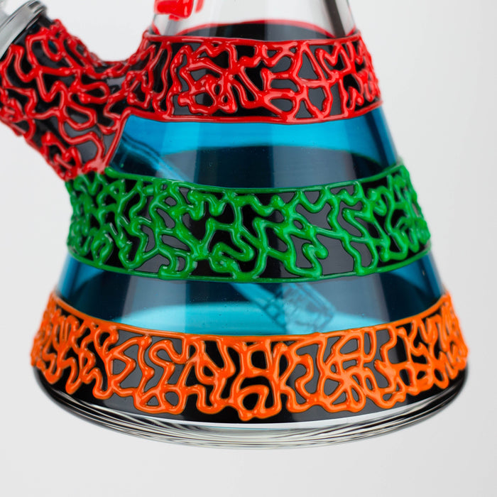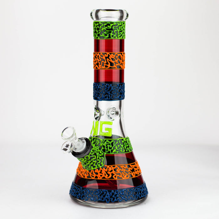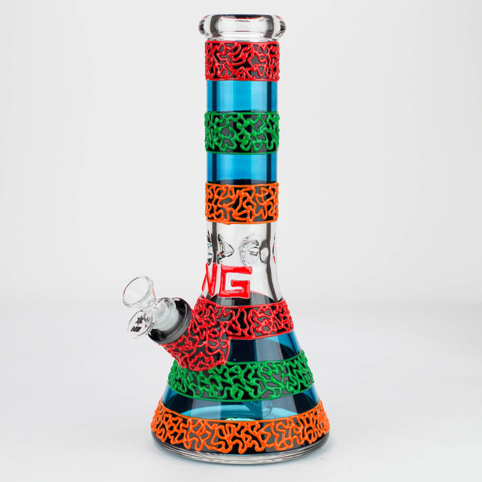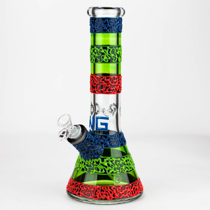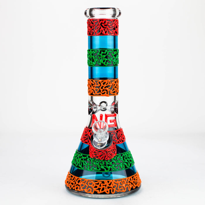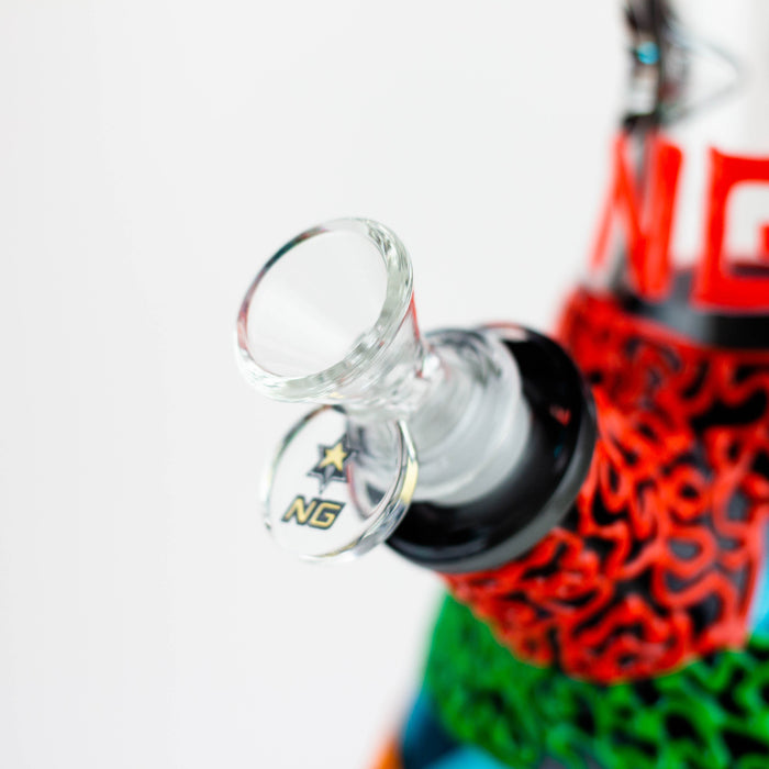 Standing at 13 inches tall but a whopping 9mm thick, this strong beaker features hand-painted colors and it glows in the dark. There are tri-color bands encircling the glass from top to base with our NG logo that also glows. Seshing by the campfire is now a lot more fun with this Nice Glass. It comes with a diffuser downstem, a herb bowl and ice pinches.
