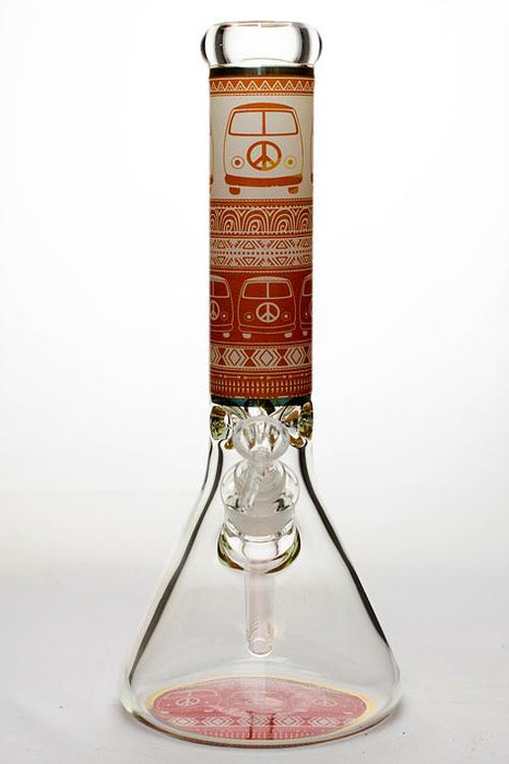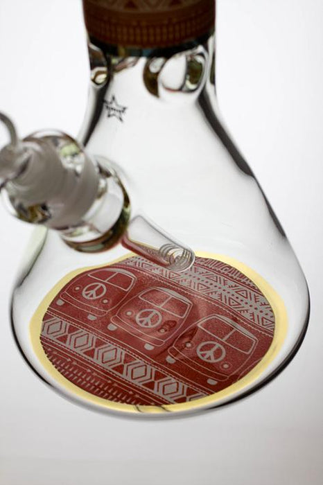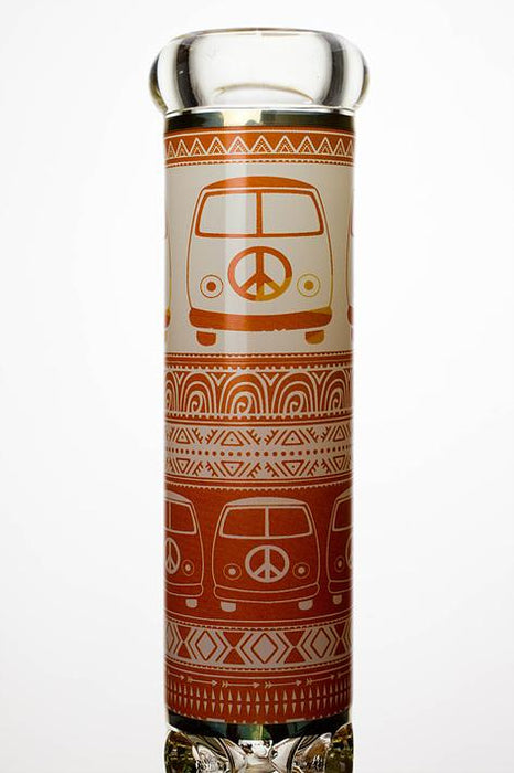 This is peace bus printed classic style beauty bong by Genie Glass. Producing 9 mm thickness tubing is very costly to product but it is well worth due to its gorgeous looks. It comes with an 14/18 mm slitted diffuser downstem and a 14 mm thick bowl. From there smoke is diffused and cooled in the main chamber. A long 9 mm thick tube keeps water from bubbling up towards the thick, comfortable mouthpiece, and ice notches will hold a few cubes for even cooler smoke. This water pipe is made of quality borosilicate glass.