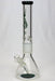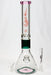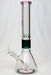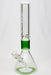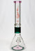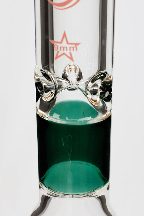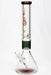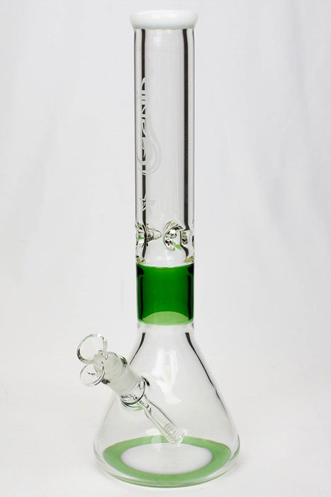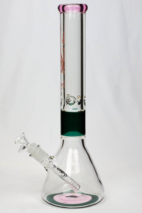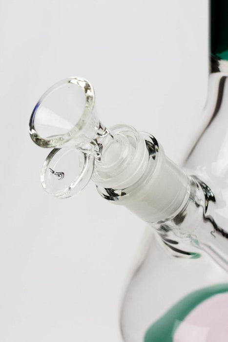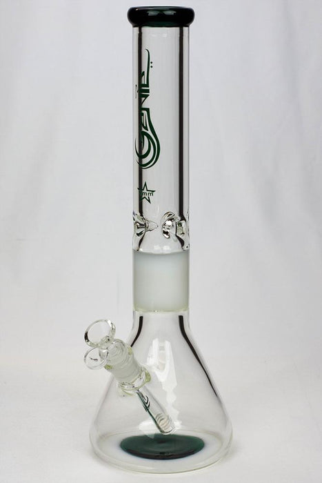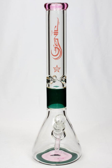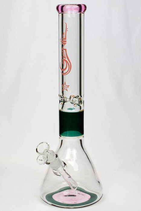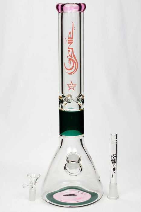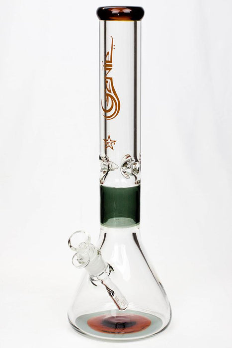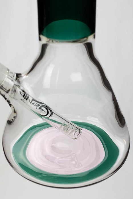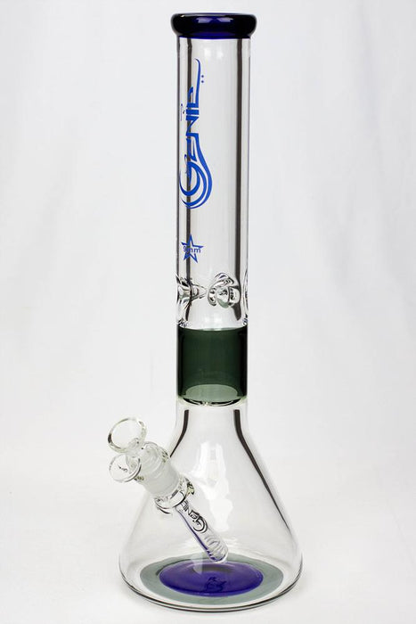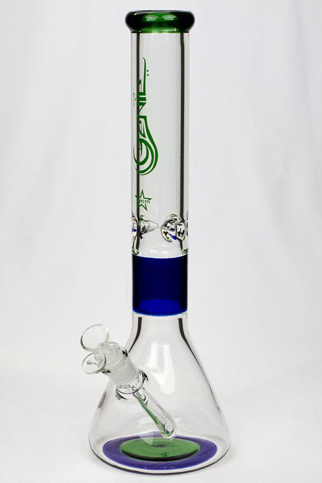 This is simple tow tone color combination accented classic style beaker bong by Genie Glass. Producing 9 mm thickness tubing is very costly to product but it is well worth due to its gorgeous and beautiful looks. It comes with an 14/18 mm slitted diffuser downstem and a 14 mm thick bowl. From there smoke is diffused and cooled in the main chamber. A long 9 mm thick tube keeps water from bubbling up towards the thick, comfortable mouthpiece, and one hole ice catcher will hold a few cubes for even cooler smoke. This water pipe is made of quality borosilicate glass.