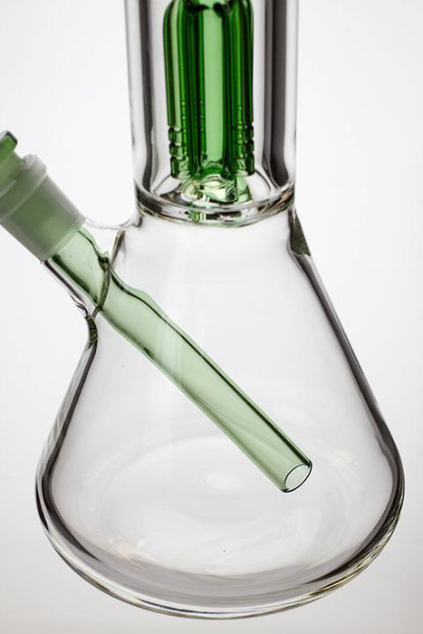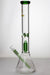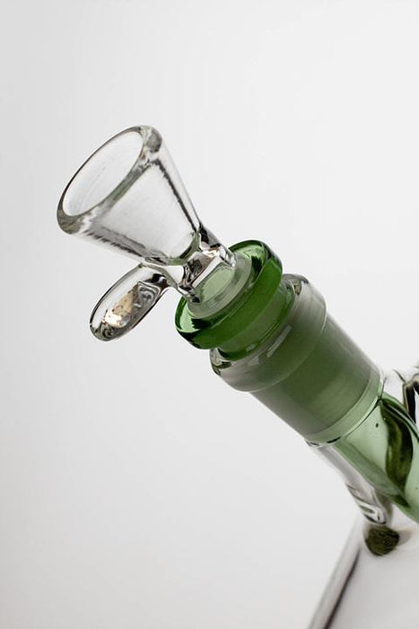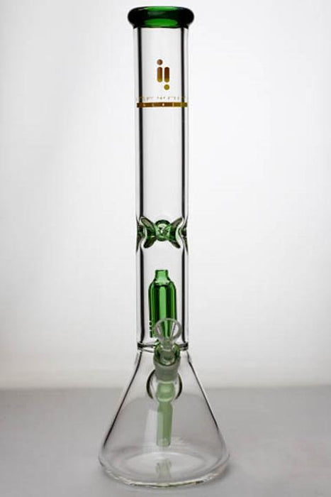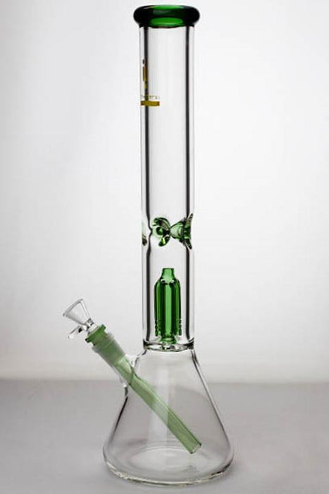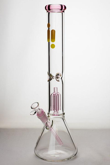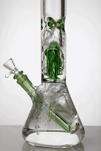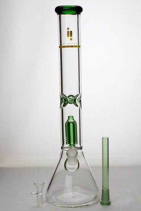 This beaker shaped premium glass bong from Infyniti Glass is made from the finest 7 mm thick quality borosilicate glass. The bong comes complete with 4 arms percolator in the midsection. This provides optimal smoke dispersion. Below the percolator is the beaker base. Above the percolator, there are three ice notches that allow the user to cool the smoke before reaching the thick colored mouthpiece. The glass bong stands at 17.5 inch tall and it comes with a 14/18 mm open-end downstem and a thick 14 mm glass bowl. The Infyniti Glass logo is tastefully printed onto the main tube.