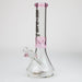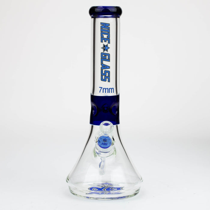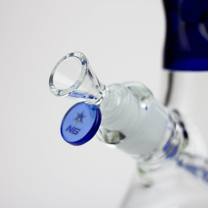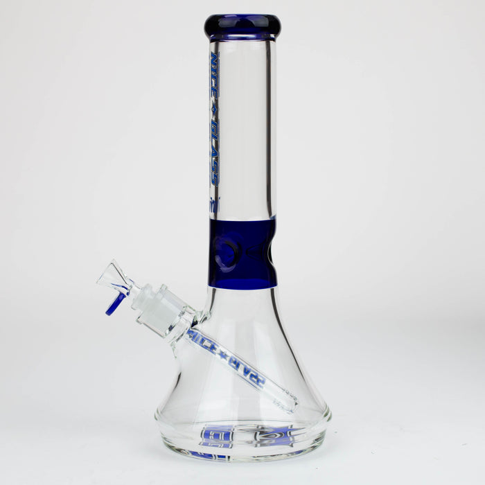 This stylized Nice Glass bong has a flat beaker base that is slightly tapered toward the tube. Ice notches are in coloured borosilicate glass, along with the thick mouthpiece and herb bowl roll stopper. The base features our NG logo in matching colour. If you want a classy long-lasting glass piece, then this one will not disappoint. Available in a range of colours.