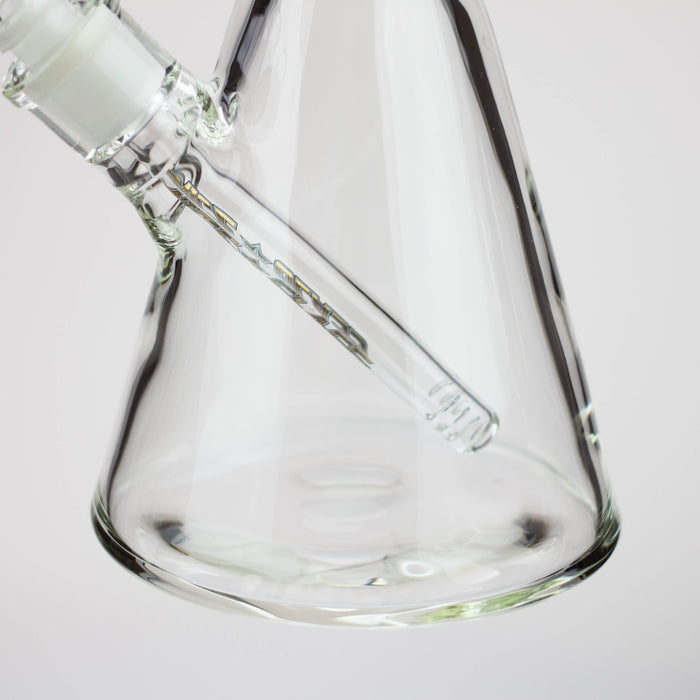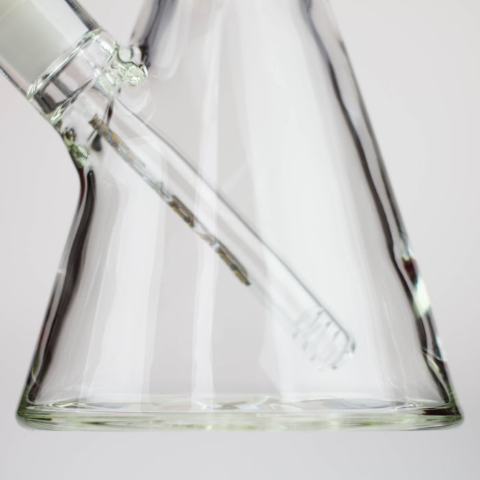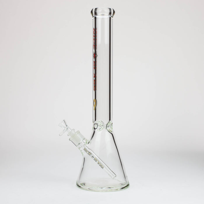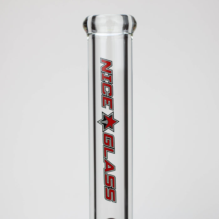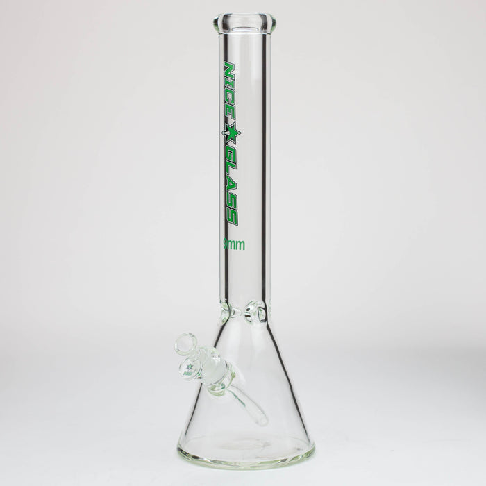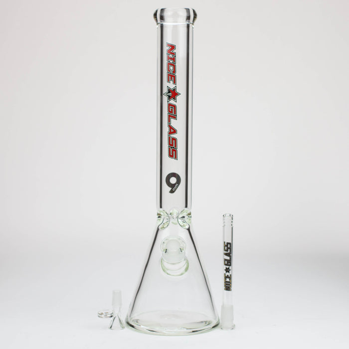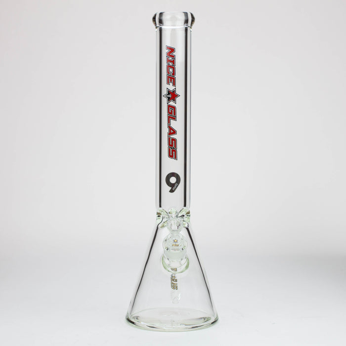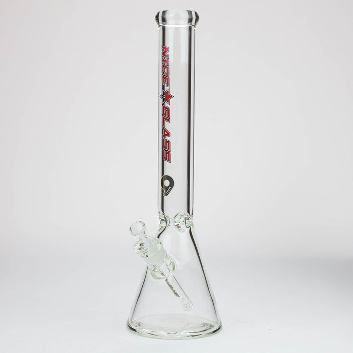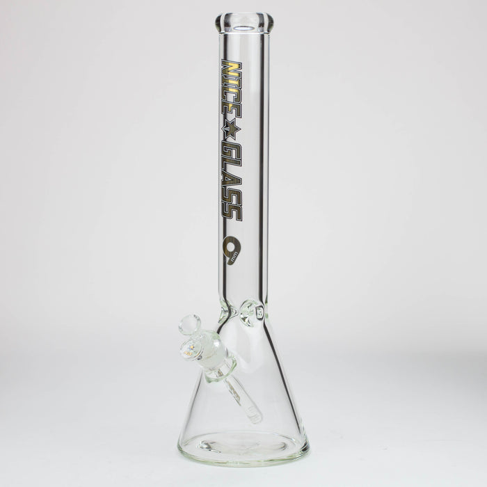 This prominent 18 inch tall Nice Glass beaker bong is at a hefty 9mm thickness. It is molded to perfection — a process eliminating any flaws and maintains consistency in thickness throughout the glass. A straight-forward beaker design with a honeycomb herb bowl and slitted downstem. This is one of our bigger and heavier pieces that is made to last and very popular with fans.