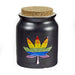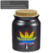 This stash jar is made of ceramic. It comes in a matt black color with a raised LGBTQ style leaf decoration in fun rainbow colors.
