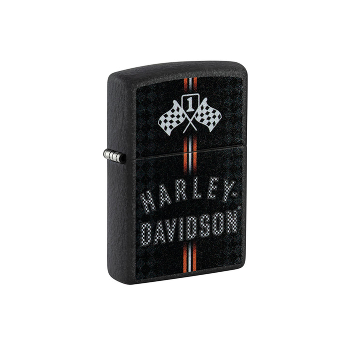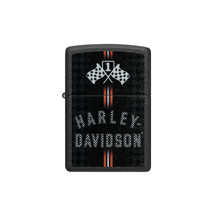 Checkered flags and racing stripes lead the eye to the Harley-Davidson wordmark on this classic Black Crackle lighter. The checker motif is continued more subtly in the background of the Color Image design, which is perfect for any Harley® motorcycle fan. Comes packaged in a gift box. For optimal performance, fill with Zippo lighter fuel.