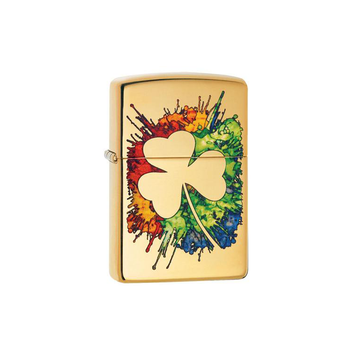 Add a splash of luck to your lighter collection with this Graffiti Clover design. Found on this High Polish Brass lighter is a silhouette of a shamrock, with an array of color splashing out from around it. This design is created with the fusion process giving the graffiti an iridescent, metallic look. Comes packaged in a gift box. For optimal performance, fill with Zippo lighter fuel.