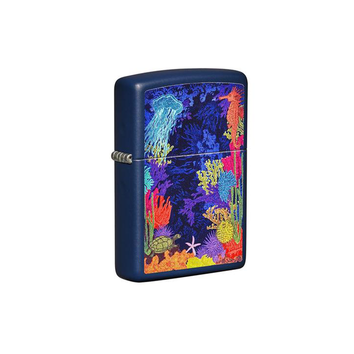 Dive deep to the ocean floor with this Sea Life design. This serene oceanic scene displays vibrant colors from the diverse life that you may find dwelling under the sea. These creatures range from turtles and jellyfish to a wide array of colorful anemones and coral. This breathtaking design is created using Zippo's color imaging process on a Navy Matte lighter. Comes packaged in a gift box. For optimal performance fill with Zippo lighter fuel.