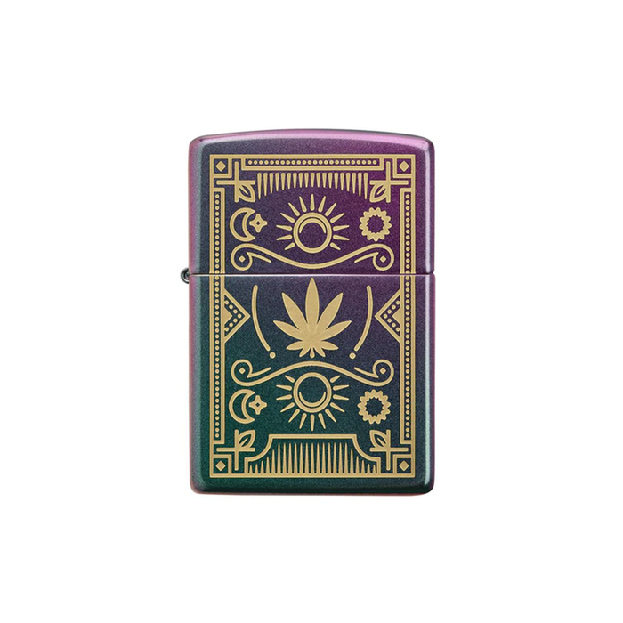 Laser engraved on an Iridescent lighter is a fresh Cannabis design. The laser engraving process carves into the lighter, exposing the brass below, which is seen in the marijuana leaf and throughout this eye-catching design. Comes packaged in a gift box. For optimal performance, fill with Zippo lighter fuel.